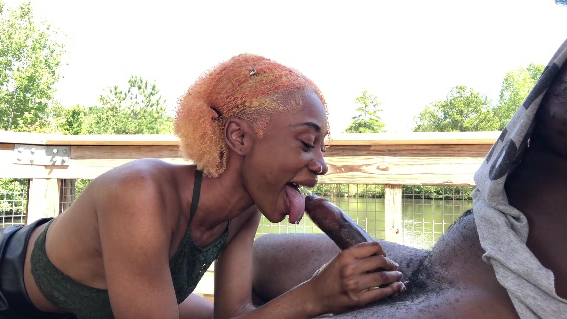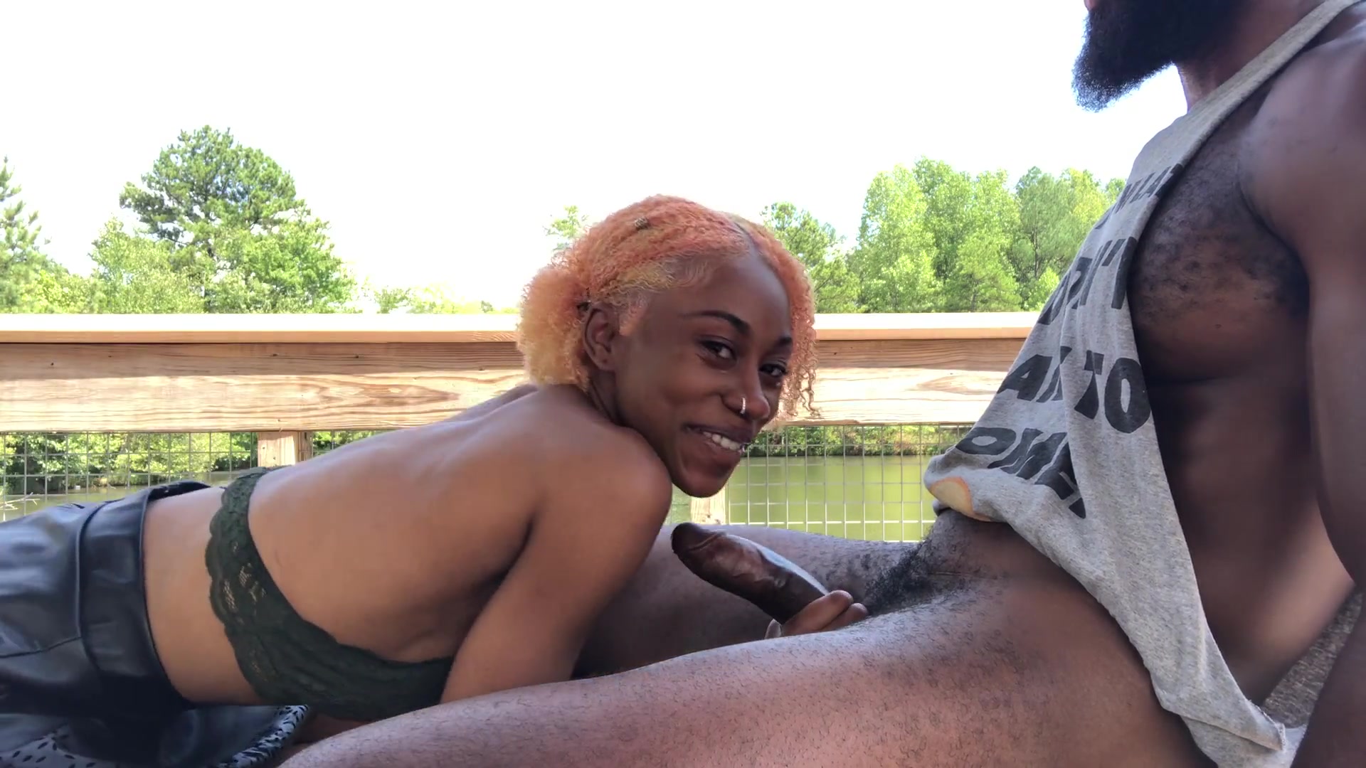 Красивая шоколадка делает минет своему темнокожему парню на свежем воздухе. Большой черный член уже полностью встал и готов к труду и обороне. Мужик наслаждается природой и расслабляется на уютном кресле, а в это время кудряшка начинает насаживаться на большой член. После нескольких фрикций веселая красотка опять поворачивается к партнеру лицом и начинает сосать. Домашнее любительское порно видео черной парочки на природе смотрим на Хуямба в режиме онлайн в HD качестве 1080p!