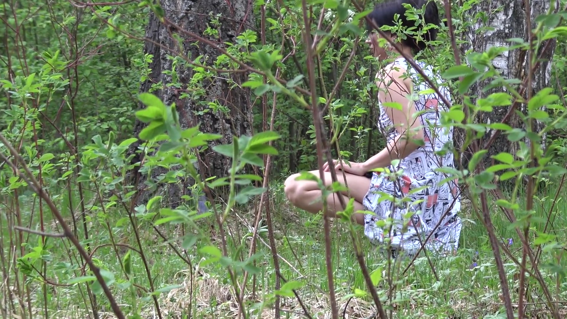 Сексуальная русская милфа Кристина гуляет парком в легком летнем платье без трусиков. Брюнетка обожает прогулки без нижнего белья, она мечтает о том, что на пути ей встретиться большой твердый член и вставит ей в горячую киску без каких-то либо препятствий. Красотка прогуливается между березок и мастурбирует заросшую киску. Есть желающие трахнуть эту горячую русскую сучку на свежем воздухе средь бела дня?